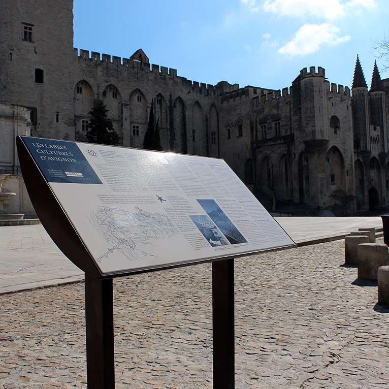 Explorer...Réalisation de 15 pupitres de lecture en acier thermolaqué avec lave émaillée pour le centre historique de la ville d'Avignon.