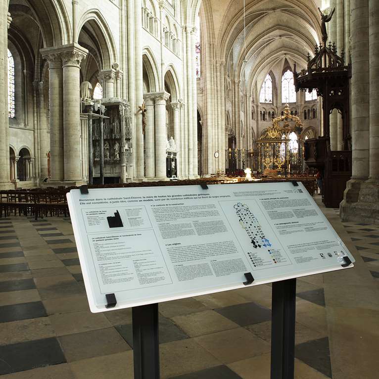 Explorer...Conception et réalisation de la signalétique d'un monument historique, la cathédrale de Sens. Fabrication de pupitres sur-mesure dotés de verre...