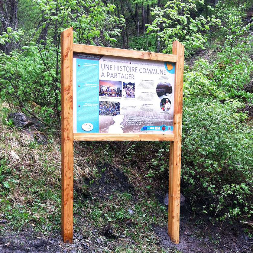 Implantation de mobilier signalétique bois réalisé en mélèze brut avec visuel en inclusion résine, le long du sentier communale patrimoniale...