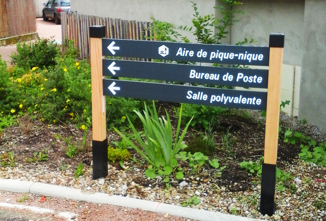 Signalétique d'intérêt local réalisée avec les matériaux suivants : - Mats bois (essence locale) - Lattes en aluminium avec adhésif anti UV - rétro réfléchissant - Platines et protections supérieures en acier thermolaqué