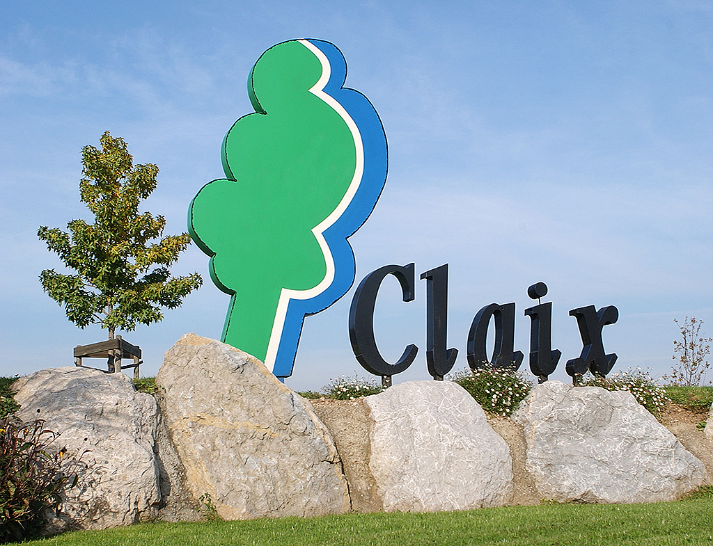 Reprise du logotype de la ville de Claix afin de créer un mobilier signalétique d'accueil en volume implanté sur un carrefour giratoire de l'une des entrées principales de la ville.