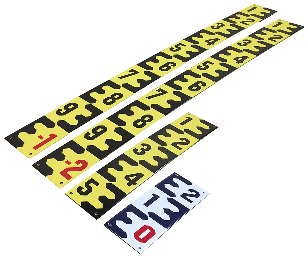 Réalisation de tôle émaillée graduée permettant d'obtenir, des échelles de crue (ou échelle limnimétrique) sur-mesure. Graphisme personnalisé, découpe en forme possible.
